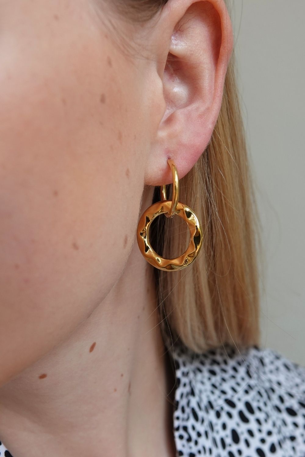 Bold yet elegant, the Gilded Links earrings are designed to make a statement. Crafted from high-quality stainless steel, these lightweight hoops feature a modern linked design with a hammered finish that catches the light beautifully.