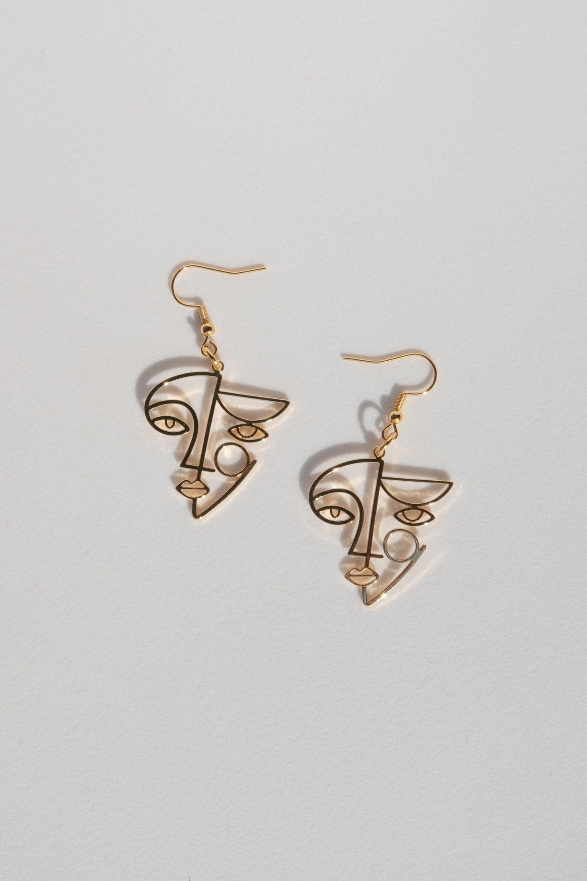 Art you can wear. These Picasso-style outline faces are golden showstoppers with a quirky twist.